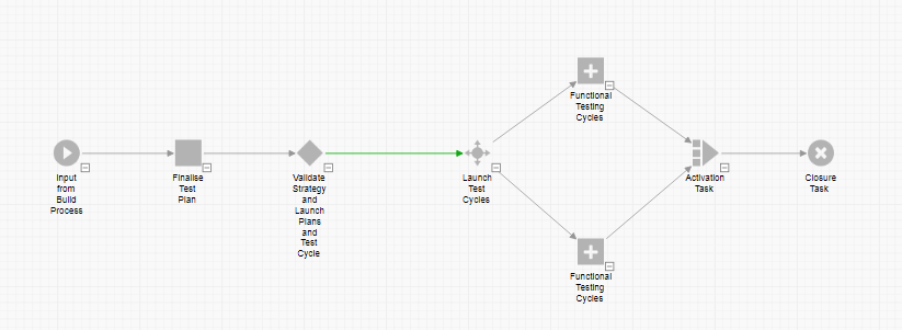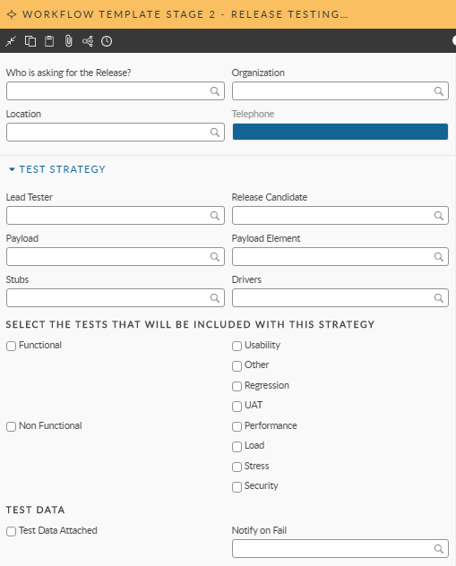In Workflow Management, we created the request screen sets for each kind of test, Functional and non functional along with a screen set for the Test Planning Strategy. In essence, we configured our system so that a test strategy for each cycle is submitted and in that strategy all the various kinds of tests that are desired are selected. Similar to placing an order. Upon submission and approval of the strategy, ASM automatically generates the requisite requests as separate workflows. We did this so that if the testing parameters or processes for an individual kind of test, Performance testing, for example changed, it would not impact any other testing processes or automations for that particular release candidate.