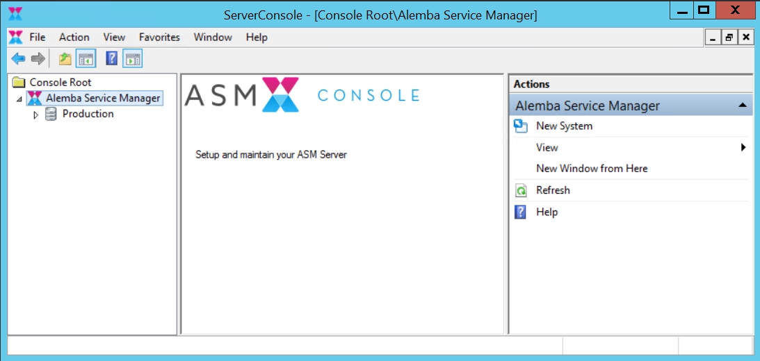 The left pane displays the folder structure within the Console Root folder. From the main Alemba Service Manager™ node you can create a new ASM System. Each system you add is listed below the main node.