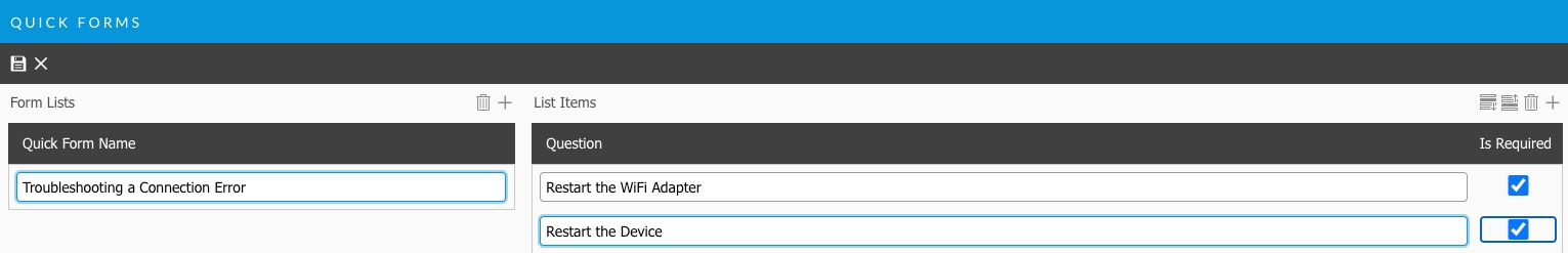To add questions to the quick form, select the form on the left, and then select the New Icon beside List Items.