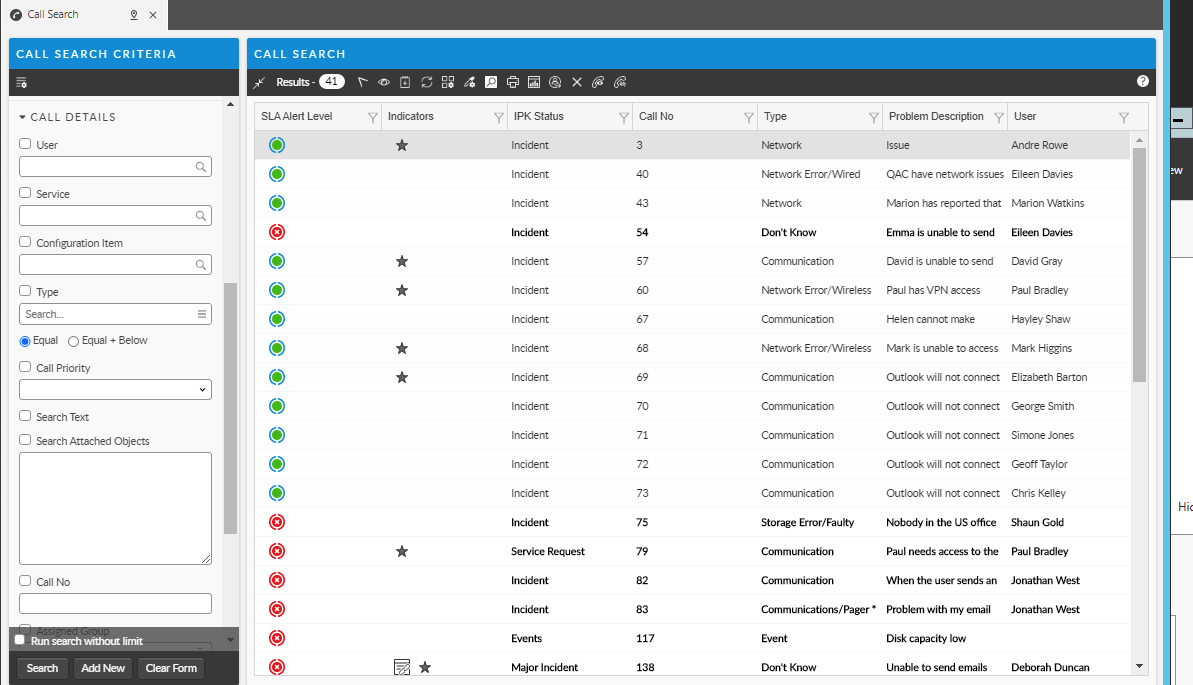 You can complete a number of fields using the search function. In any field with a magnifying glass in it, simply start typing and the system will dynamically match the data. If configured for example, you can start typing a user ID in the User field and the friendly name will appear, or the serial number in the CI field and the correct CI will appear.