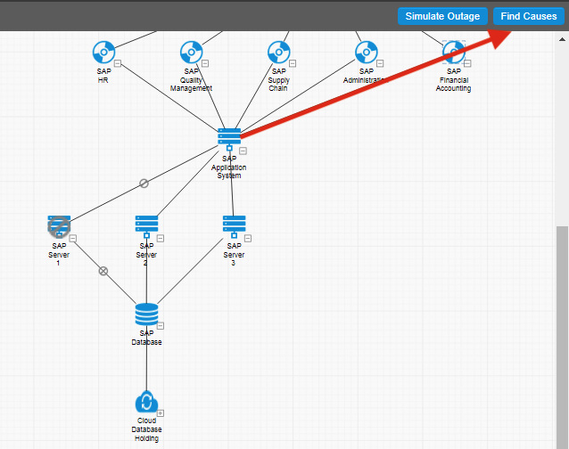 A User calls the service desk to report that their SAP system is not working. You can use the Linking Diagram to see if there are any current outages that may be causing the issue. If not, you can use the Find Causes feature to visually track where the problem may be originating, or to perform more formal Fault Tree Analysis.