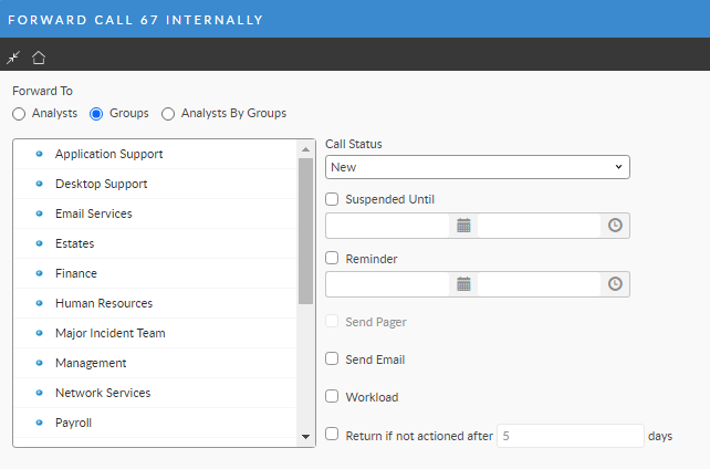 If a group is selected in this view, the call will be forwarded to the analyst and not the group. However, the call will be assigned to the selected group.