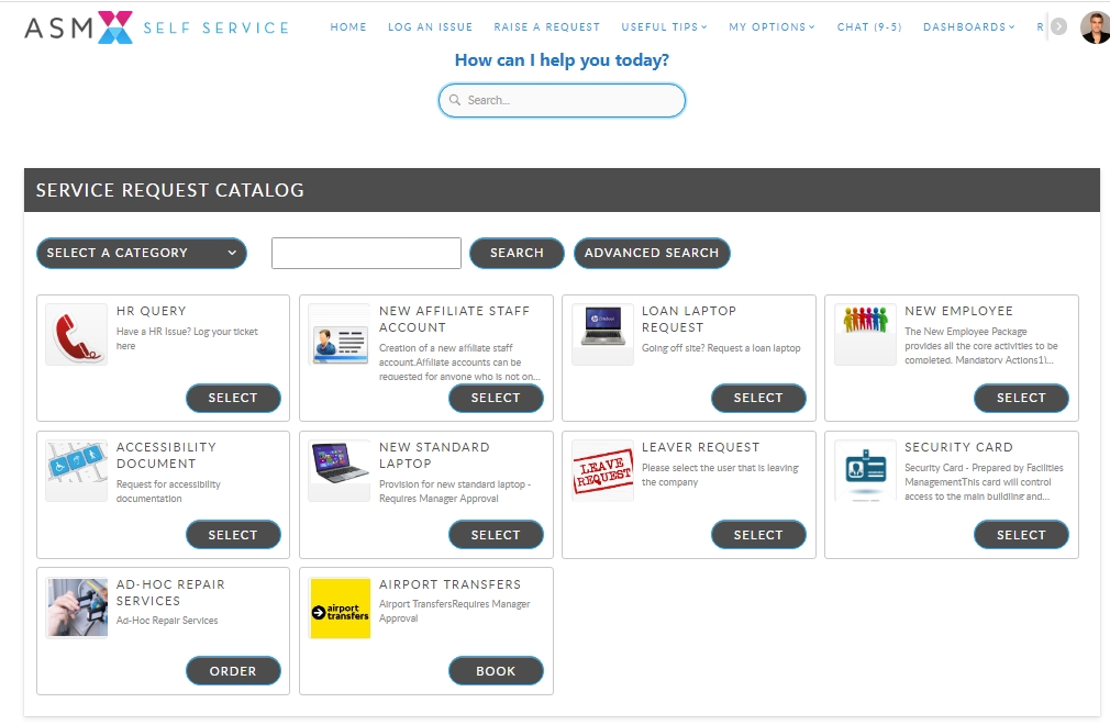 The Service Request Catalog is a listing of all services that are available to you. The Service Request Catalog menu option provides a search facility that enables you to search for and view available services. You can search for services and log an Incident against a service or request a service.