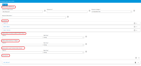 Configure the resources that you defined in the Connector Builder. This enables you to view the resource type configured on a selected source and create mappings for each of these resource types. This will allow you to create mappings between the external resource and ASM CMDB item fields.