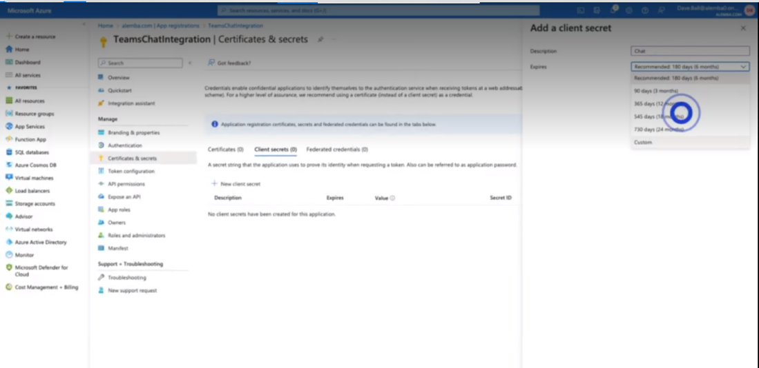 Add a client secret and click on New Client secret. Give a description for the client secret and set the client expiry date by providing a custom date or set a predefined expiry period. Remember to make a note of the expiry date as MS Teams will stop working once expired. Press on Add.