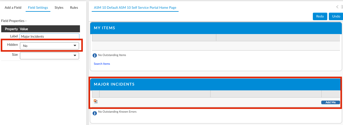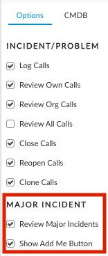 * Access the self service portal Roles - **Options Tab** and select **Review Major Incidents** and the **Show Add Me Button** options.