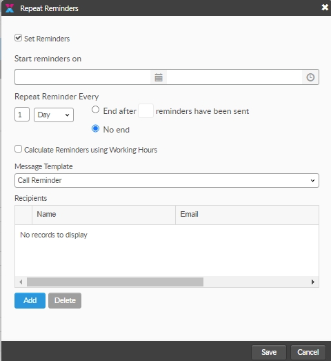 The Repeat Reminders window can be used to configure a reminder that sends one notification, or repeatedly sends notifications at a defined interval for a defined number of repeats, or until closure/completion of the call, request or task. Multiple recipients can be defined for repeat reminders and the notifications sent by email or pager.