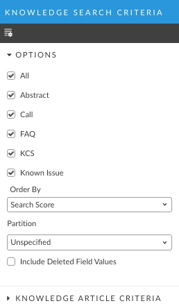 The Knowledge Article Criteria section contains fields that allow you to search on the following criteria: