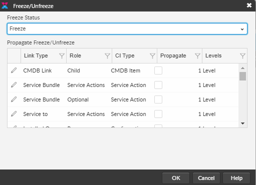 > * Select a Level (1, 2, 3, or Unlimited) to propagate the freeze to the linked item, as well as items linked to that item. If you select 1, the items listed under the Linked Items tab (matching the particular Link Type, Role, and CMDB Type) are also frozen. If you select 2, the freeze is also applied to the items listed under the Linked Items tab for the linked items (and so on).