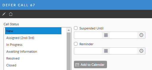 Select the reason that best describes why you are deferring the call. Call statuses are defined by the system administrator. If call statuses are not defined, the window appears with only the default call status ‘Default’. In this case, that status is automatically assigned to the call when you defer it.