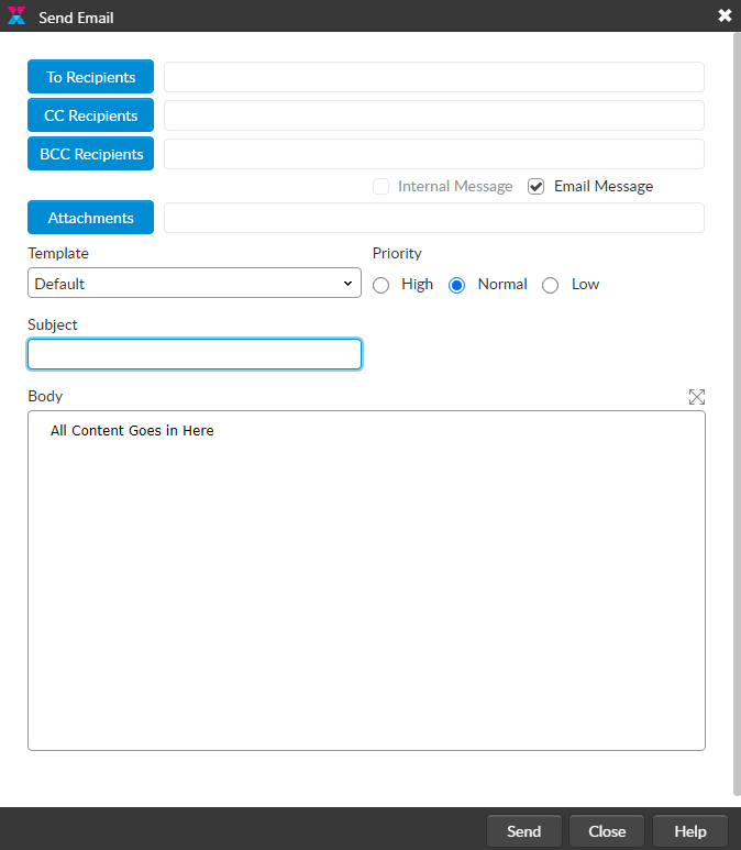 Whether you select to send the email from within a Details window, or by using the Message option from within the menu, the same window appears.
