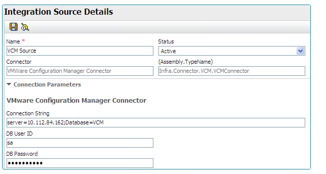 When creating a new VMware vCenter Configuration Manager source from the Source option of the Integration Platform, some specific parameters have to be entered as follows: