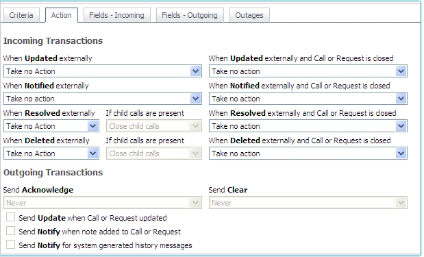 All other Incoming Transactions should be configured to Take No Action as follows:
