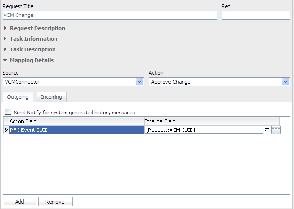 At appropriate points in your ASM Core Change Management process, you should insert Outbound Action tasks that approve or deny changes. The only important field to map is the RFC Event GUID as follows: