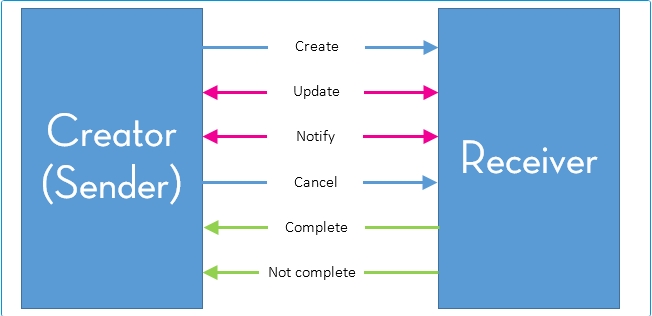The connector operation is symmetrical. This means that in some instances one of the systems acts as the Creator, creating calls or requests in the other system, and in other instances the same system acts as the Receiver, calls or requests being created internally based on instructions sent by the other system.