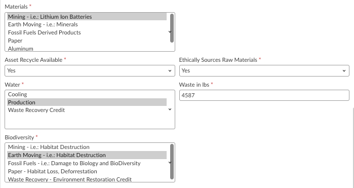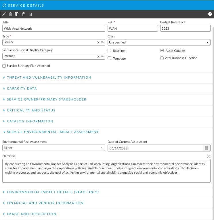 You can update the results of the Environmental Impact analysis directly to the service and therby closing the loop on the assessment. This also exposes the data to the service and allows you to use it for reporting and additional analytics that you will need for your TBL Accounting program.