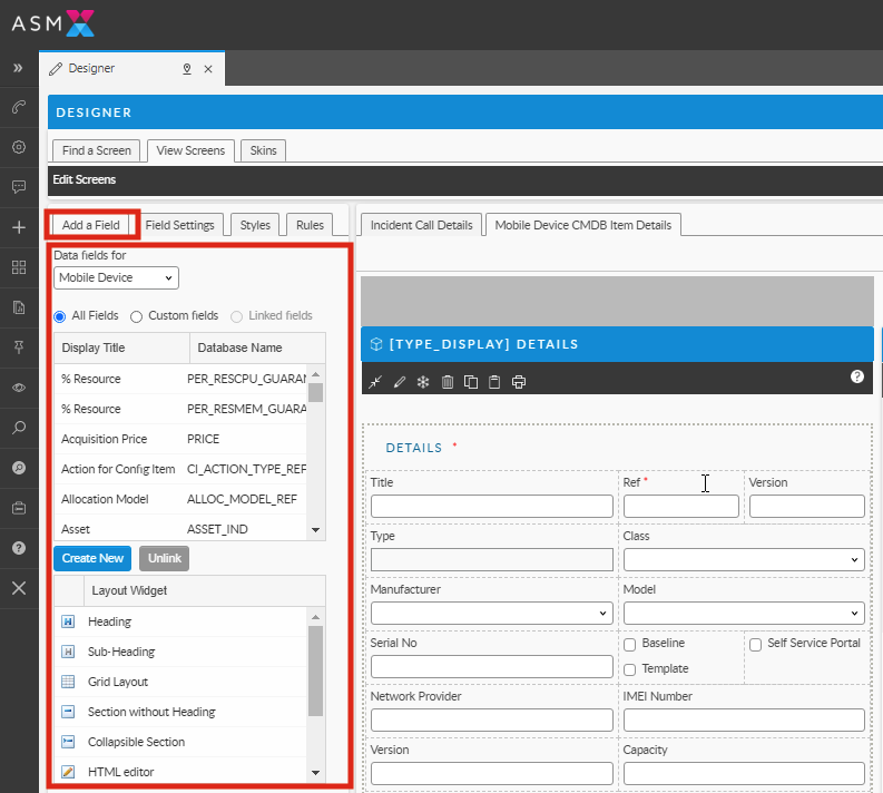 You can remove layout elements from screens within ASM Designer. This permanently removes the layout element as well as any fields contained within it. If you do not wish to permanently remove the element, you can flag it as "hidden" using the Field Settings tab.