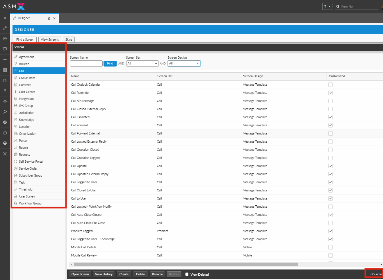 * The left pane contains an alphabetical list of the main entity types in ASM Core (such as, Agreement, Bulletin, Call, etc) with which screens are associated.