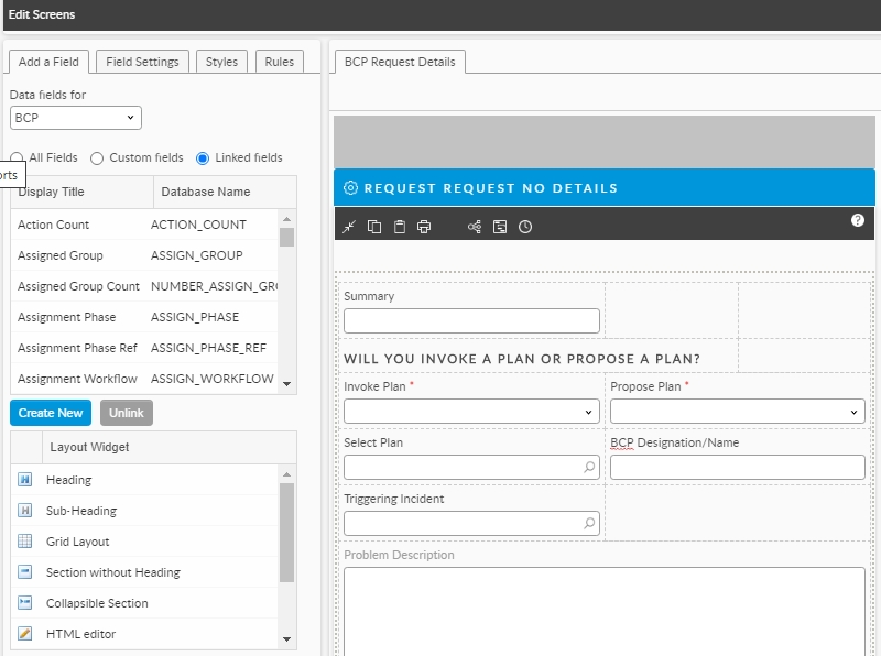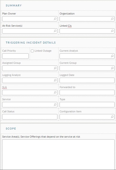 In the example below, the linked fields from the triggering incident only show if the New Plan check box is not checked. If it is checked, then that section does not appear but rather, the section to collect details about the new plan show.