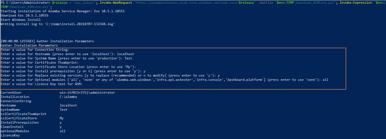 Set-ExecutionPolicy -ExecutionPolicy Unrestricted -Scope Process -Force; Invoke-WebRequest "https://alembareleases.blob.core.windows.net/asm- core/eos_latest" -OutFile "$env:TEMP\Download_ASMCore.ps1"; Invoke-Expression "$env:TEMP\Download_ASMCore.ps1";The script will download the necessary files and prompt for various information as required GO TO STEP 3, Entering Parameters