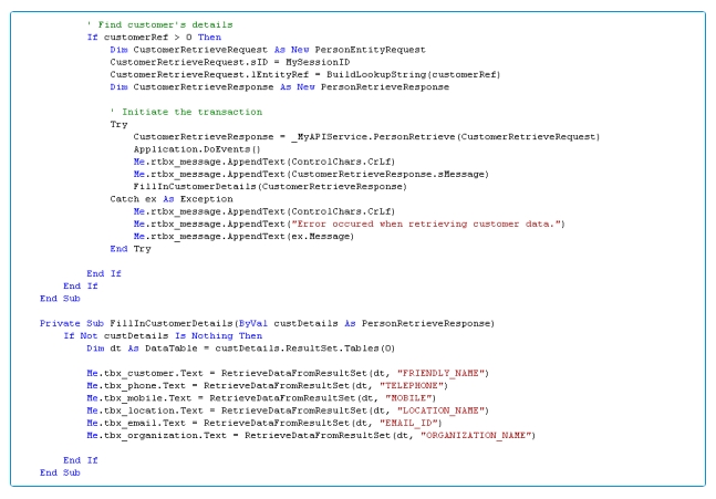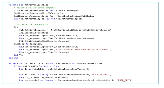This code example uses the LogIn Transaction to log on to ASM, run the CallRetrieve Transaction to retrieve the User on a call and the PersonRetrieve Transaction to retrieve details relating to this User.
