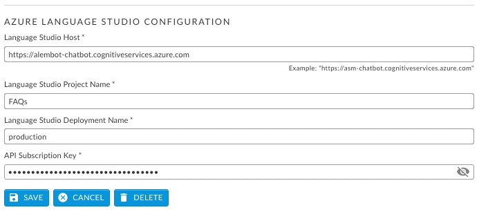 Connect ASM to the Azure Language Studio Service by filling the fields on the Chatbot Settings page. All fields are required.