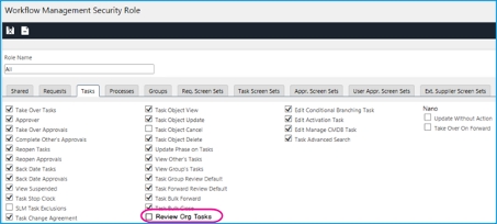 Workflow Management Security Role -> Tasks Tab: Review Org Tasks - On.