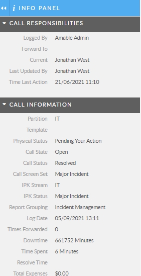 Typically, the Info panel displays the main details of the item in summary form, as well as the Analyst who created it, the date on which it was created, and any update details.