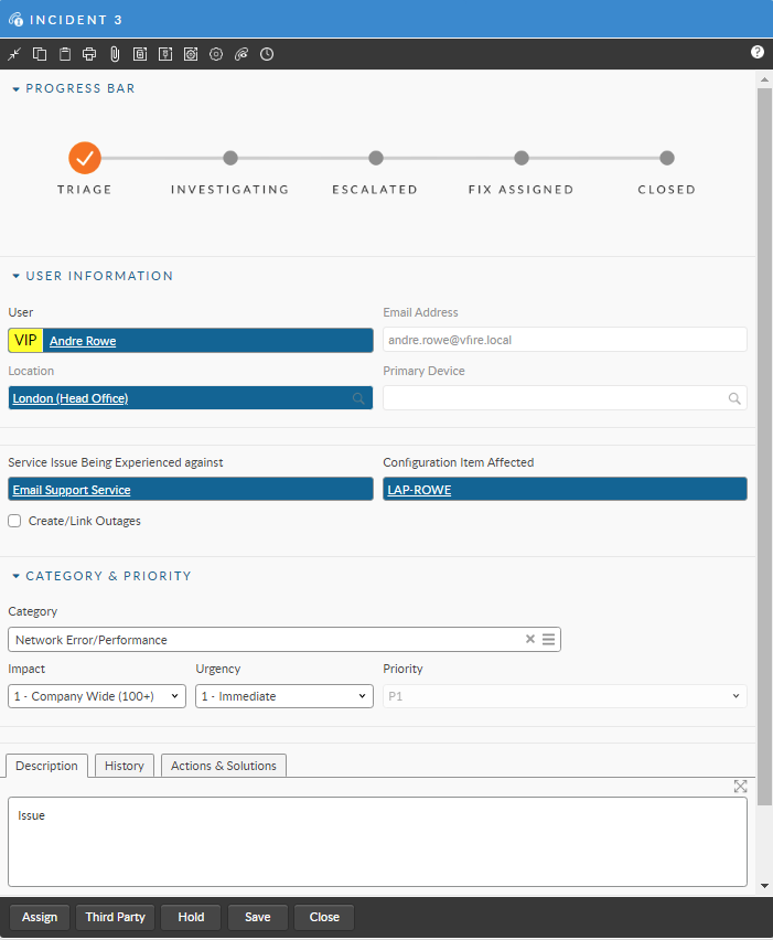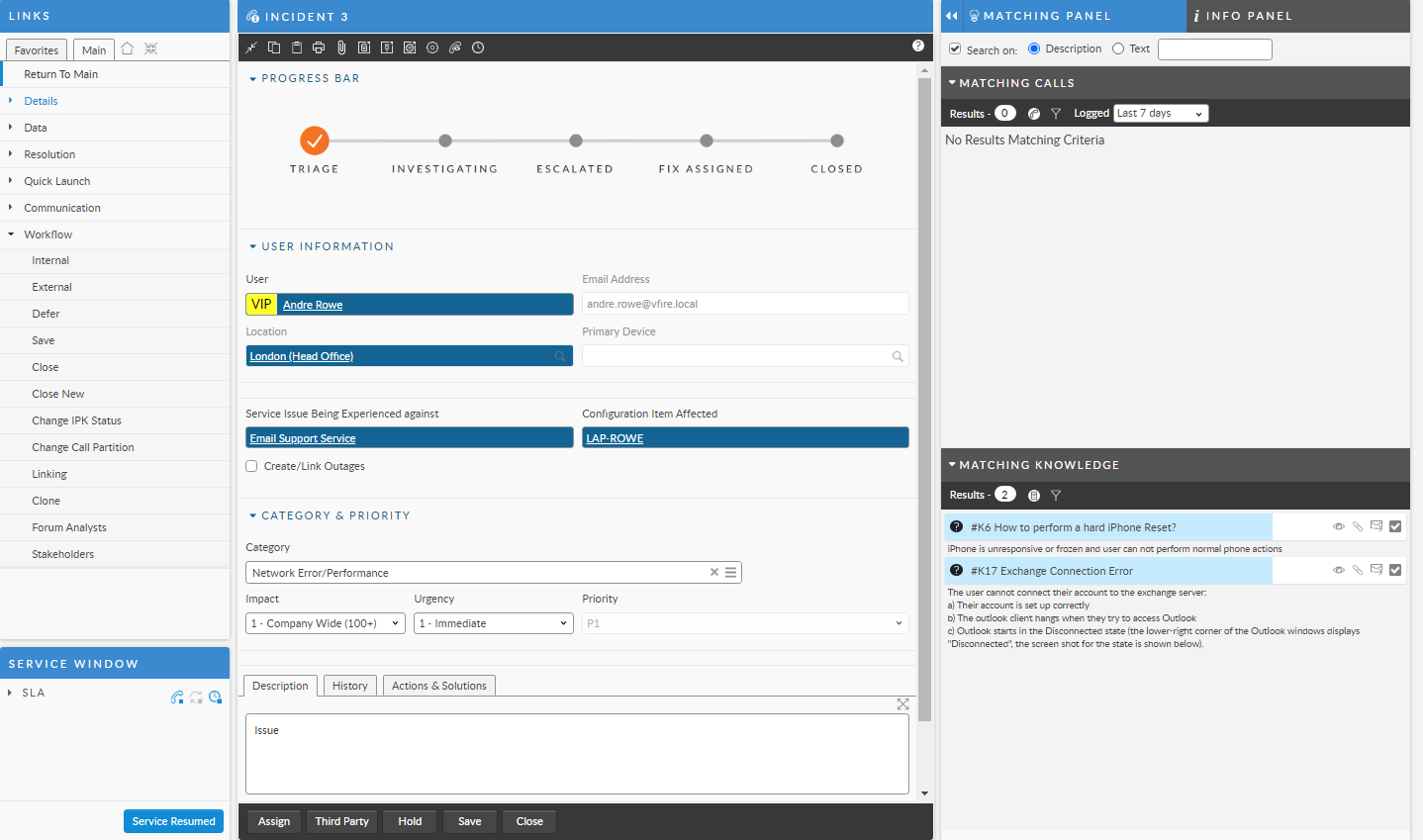 * The bottom of the Call Details window has three important tabs: **Description** (the issue), **History** (a summary of the call history), and **Actions & Solutions** (the actions entered by the analyst handling the call)