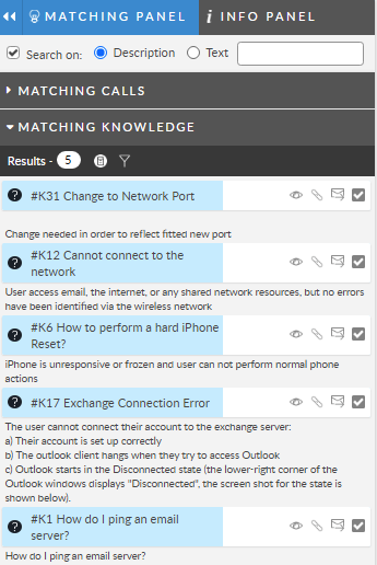 * The Matching panel is also included on the right, next to the Information panel.  It dynamically matches other calls and knowledge based on data found in the current ticket.  You can chage the filters to refine the results.