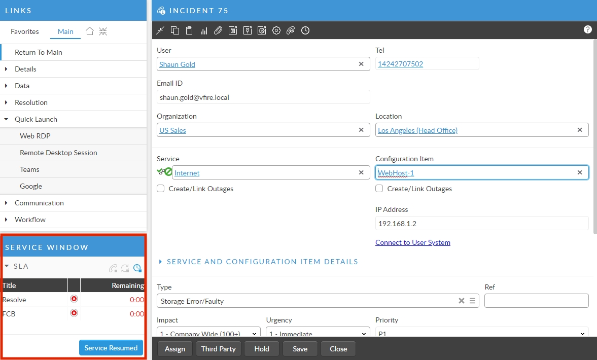This is useful if the immediate issue has been resolved, but you wish to keep the call open, or the call is awaiting comments from a particular closure group. Agreement events are closed off when a call is closed or resolved (a call may have a status of Open-Resolved if it has been forwarded to a closure group, for example, if closure rules are configured or through an IPK workflow rule). The Service Resumed button only appears if there is an open agreement on the call. Once clicked, it is removed until a new agreement is applied to the call.