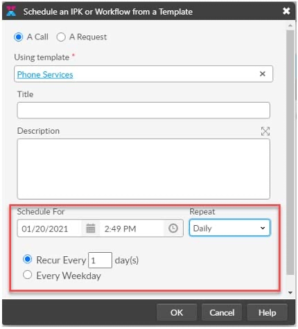 Use the drop-down list to specify how often this request should be created. You can select the request to be created once (no repeat of this request), daily, weekly, fortnightly, monthly or quarterly