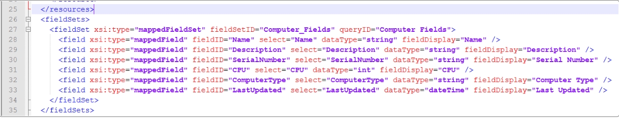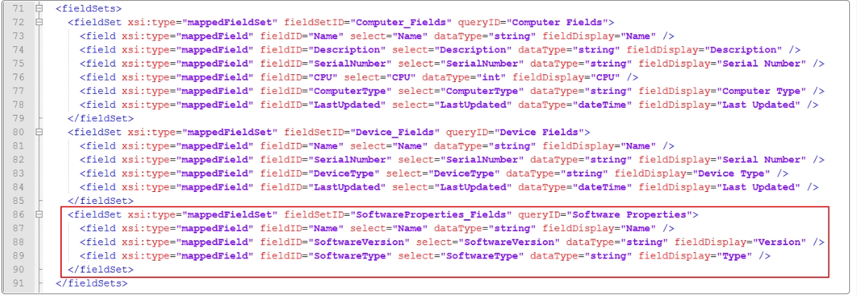 Identify the line pair that contain </fieldSets> and <queries> respectively. Between those lines add code as shown in the image below, from line 92 to 103.