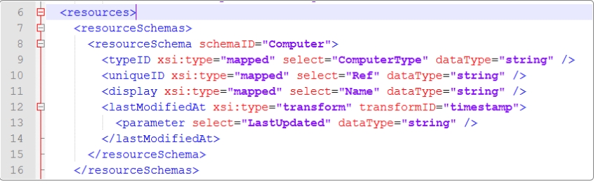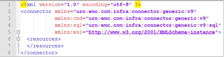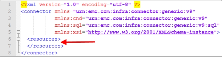 Open Alemba®.Connector.SQL.FedCMDB.icnf. Identify the line pair that contain <resources> and </resources> respectively. Between these two lines, insert code from steps 2 and 3 below. Code from steps 4 and 5 is inserted between the lines that contain </resources> and </connector> respectively.