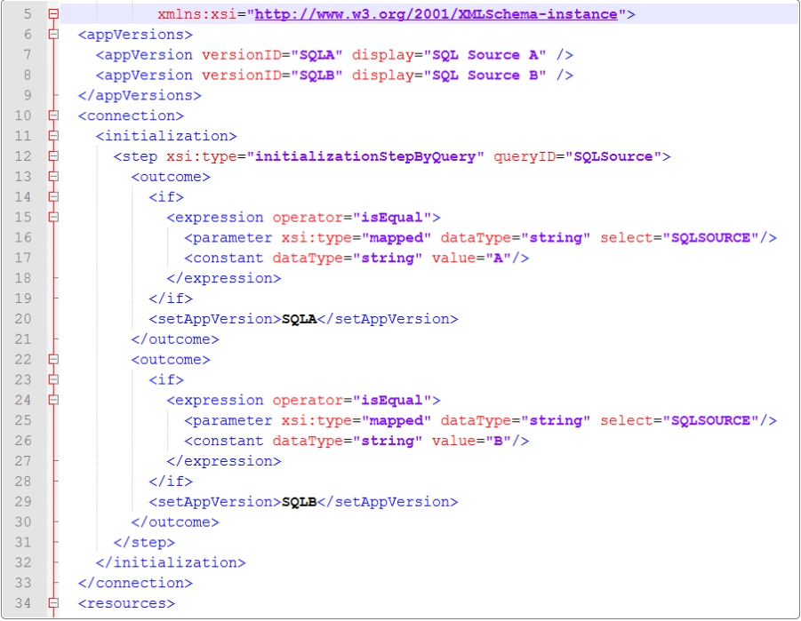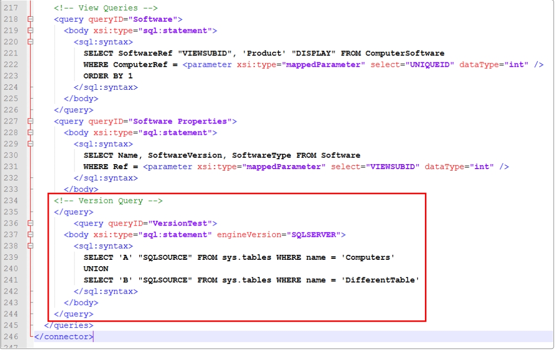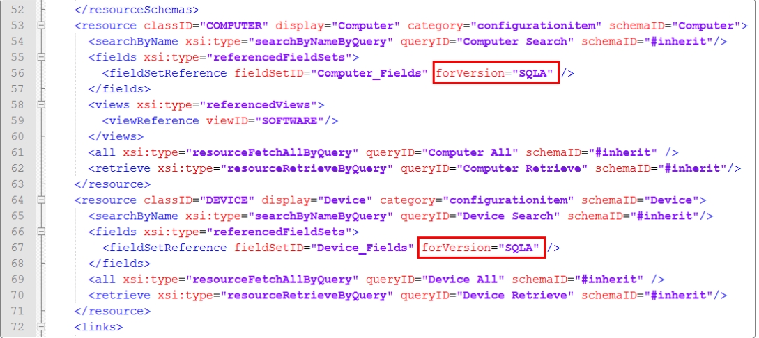 Within the resource section where the query names are defined, insert the forVersion attribute to identify the intended source. Add code to the icnf file as shown in the image below, to lines 56 and 67.