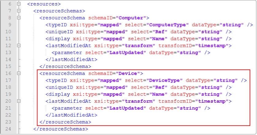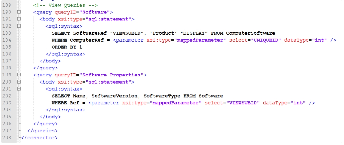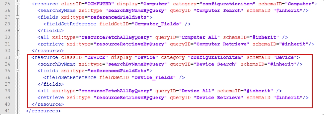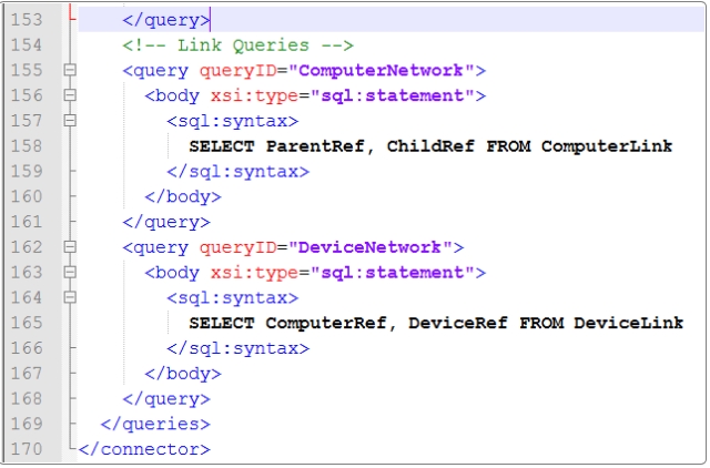 Open the Alemba®.Connector.SQL.FedCMDB.icnf file that was modified during Stage 1. Code for the additional resource type is inserted into existing corresponding sections of the icnf file.