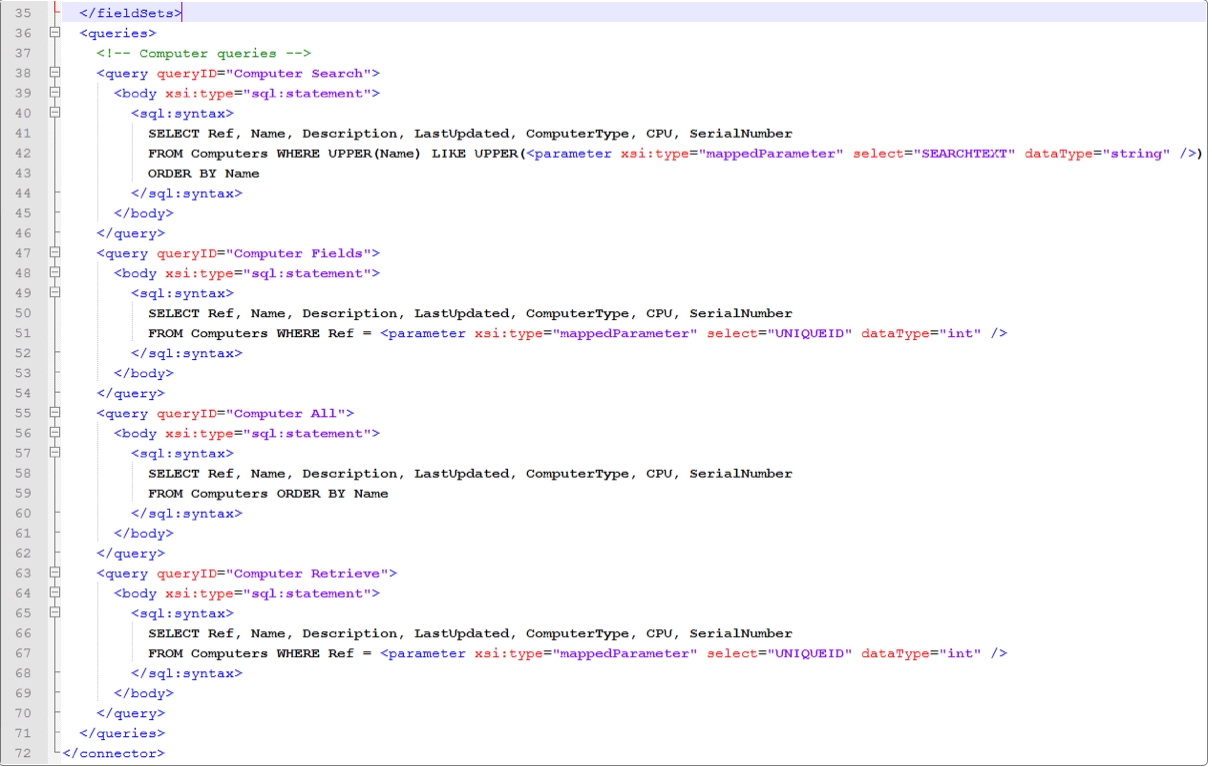 Open Alemba®.Connector.SQL.FedCMDB.icnf. At this stage it contains only generic code for the connector with no code for resources, fields, or links.