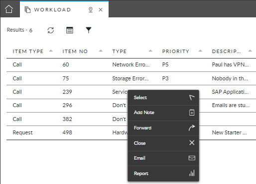 The Workload Outstanding window displays all work items requiring your attention. Depending on your Security Roles, this can include calls, request, and tasks.