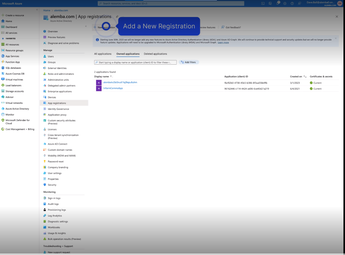 In the Azure Portal select Azure Active Directory, go to App registrations in the Menu and click on Add a New Registration.