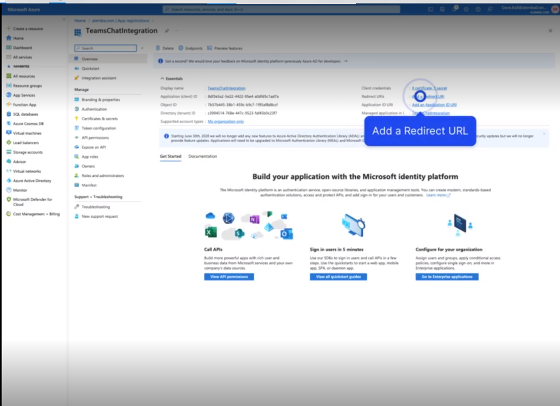 In the App Registration Overview section: copy the Application (Client) ID and the Directory (Tenant ID)
