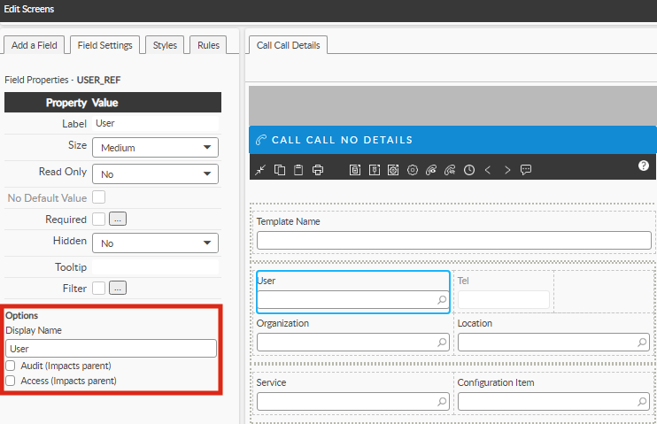 In most cases, changes to these properties only apply to the selected screen. Fields that are on related records, such as a user’s telephone number on a Call screen, are Read Only by definition, so you cannot apply a condition or make them required. You can however make them conditionally Hidden.