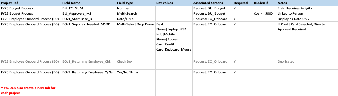 > * **Note the 2 versions of the same field, "Returning Employee".**  Since projects usually involve several build, test, and fix/redeploy cycles, you may need to differentiate between iterations, sprints, or versions, of the same development project.  This really depends on the scope of the project and your own organizations development practices.&#x20;