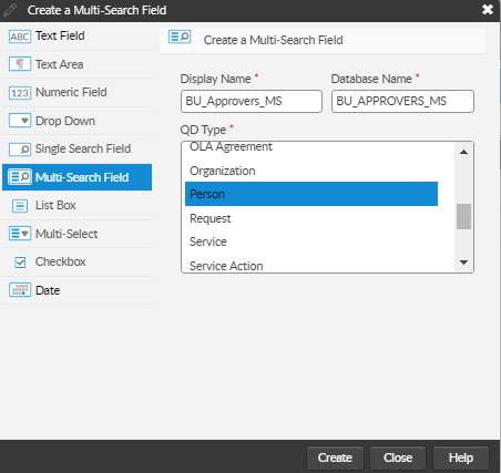 <table><thead><tr><th width="168">Text Field</th><th>Enables input of a single line of text in the field. Text can include all alphanumeric and special characters.</th></tr></thead><tbody><tr><td>Text Area</td><td><p>Enables input of multiple lines of text.</p><p>Text Area custom fields cannot be used in rules for Conditional Branching tasks or in Rules Builder, and cannot be added as search criteria on Search windows.</p></td></tr><tr><td>Numeric Field</td><td>Enables input of numeric values – both integers and decimal fraction numbers.</td></tr><tr><td>Drop Down</td><td><p>Drop-down list fields can be used to create a list of values from which one can be chosen.</p><p>Select the list of values for the drop-down. You can either use an existing list of values (such as the Call Priority list), or you can create your own.</p><p>To use an existing list, select <strong>Assign an existing list</strong> and select a list, scrolling down if necessary. You can edit, copy or delete lists created in-house. (Standard lists can be edited in the relevant area of System Administration.)</p><p>To use vCloud CMDB item types, ensure that you select the (vCloud) CMDB Item Type. Selecting another CI type would not trigger the filtering mechanism that is possible with the (vCloud) CMDB type.</p><p>To create a new list and define your own values, select <strong>Create List</strong> and specify the list details.</p></td></tr><tr><td>Single Search Field</td><td><p>Enables the search and selection of one value in this field. The entity type configured for the QD field determines the type of items returned in the search and available for selection for the screen or submission form.</p><p>At <strong>QD Type</strong>, select the entity type you want to use. If you select a sub entity type (such as User which is a type of Person), then the values which can be selected in the QD field are limited to the sub type (that is, only person records designated as Users can be selected in a User entity type QD).</p><p>You can create the following:</p><p>·      Analyst</p><p>·      Call - available as of GAIA (ASM Version 10.4) </p><p>·      CMDB Item</p><p>·      Configuration Item</p><p>·      Cost Center</p><p>·      External Supplier</p><p>·      IPK Group</p><p>·      Knowledge - available as of GAIA (ASM Version 10.4) </p><p>·      Location</p><p>·      OLA Agreement</p><p>·      Organization</p><p>·      Person </p><p>·      Request - available as of GAIA (ASM Version 10.4) </p><p>·      Service</p><p>·      Service Action</p><p>·      Service Bundle</p><p>·      SLA Agreement</p><p>·      UC Agreement</p><p>·      User</p><p>·      Workflow Group</p></td></tr><tr><td>Multiple Search Field</td><td><p>Enables the search and selection of multiple values in this field. The entity type configured for the QD field determines the type of items returned in the search and available for selection for the screen or submission form. Using a QD field on a submission form within ASM Self Service is similar to using QD fields within ASM Core.</p><p>You can create the following:</p><p>·      Analyst</p><p>·      Analyst</p><p>·      Call - available as of GAIA (ASM Version 10.4) </p><p>·      CMDB Item</p><p>·      Configuration Item</p><p>·      Cost Center</p><p>·      External Supplier</p><p>·      IPK Group</p><p>·      Knowledge - available as of GAIA (ASM Version 10.4) </p><p>·      Location</p><p>·      OLA Agreement</p><p>·      Organization</p><p>·      Person </p><p>·      Request - available as of GAIA (ASM Version 10.4) </p><p>·      Service</p><p>·      Service Action</p><p>·      Service Bundle</p><p>·      SLA Agreement</p><p>·      UC Agreement</p><p>·      User</p><p>·      Workflow Group</p></td></tr><tr><td>List box</td><td><p>List boxes can be used to create a list of values that are displayed on screen from which one can be chosen.</p><p>Select the list of values for the drop-down. You can either use an existing list of values (such as the Call Priority list), or you can create your own.</p><p>To use an existing list, select <strong>Assign an existing list</strong> and select a list, scrolling down if necessary. You can edit, copy or delete lists created in-house. (Standard lists can be edited in the relevant area of System Administration.)</p><p>To use vCloud CMDB item types, ensure that you select the (vCloud) CMDB Item Type. Selecting another CI type would not trigger the filtering mechanism that is possible with the (vCloud) CMDB type.</p><p>To create a new list and define your own values, select <strong>Create List</strong> and specify the list details.</p></td></tr><tr><td>Multi-Select</td><td><p>Like drop-downs, multi-select fields can be used to create a list of values. However, in this case one or more values can be selected from the list.</p><p>Select the list of values for the drop-down. You can either use an existing list of values (such as the Call Priority list), or you can create your own.</p><p>To use an existing list, select <strong>Assign an existing list</strong> and select a list, scrolling down if necessary. You can edit, copy or delete lists created in-house. (Standard lists can be edited in the relevant area of System Administration.)</p><p>To use vCloud CMDB item types, ensure that you select the (vCloud) CMDB Item Type. Selecting another CI type would not trigger the filtering mechanism that is possible with the (vCloud) CMDB type.</p><p>To create a new list and define your own values, select <strong>Create List</strong> and specify the list details.</p></td></tr><tr><td>Checkbox</td><td>Can be used to denote binary values. A checkbox can have only two states - it can either be selected or cleared.</td></tr><tr><td>Date</td><td>Enables input of a date in the field.</td></tr></tbody></table>