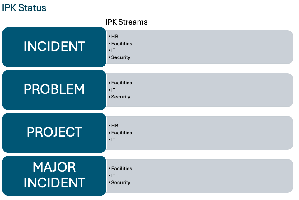 > For instance, if we consider the Facilities department within an organization, they may have numerous teams concentrating on different areas, such as Procurement, Assets, or Maintenance. Despite the variety of teams, they require only one stream dedicated to break/fix issues, which would fall under the Incident category. Additionally, they might have streams under other statuses, such as hiring processes under HR, or tackling complex facility maintenance issues under the Problem status.  For the purpose of System Configuration, we only define the stream as Facilities and link it to the IPK Status' to which Facilities needs to be able to work.