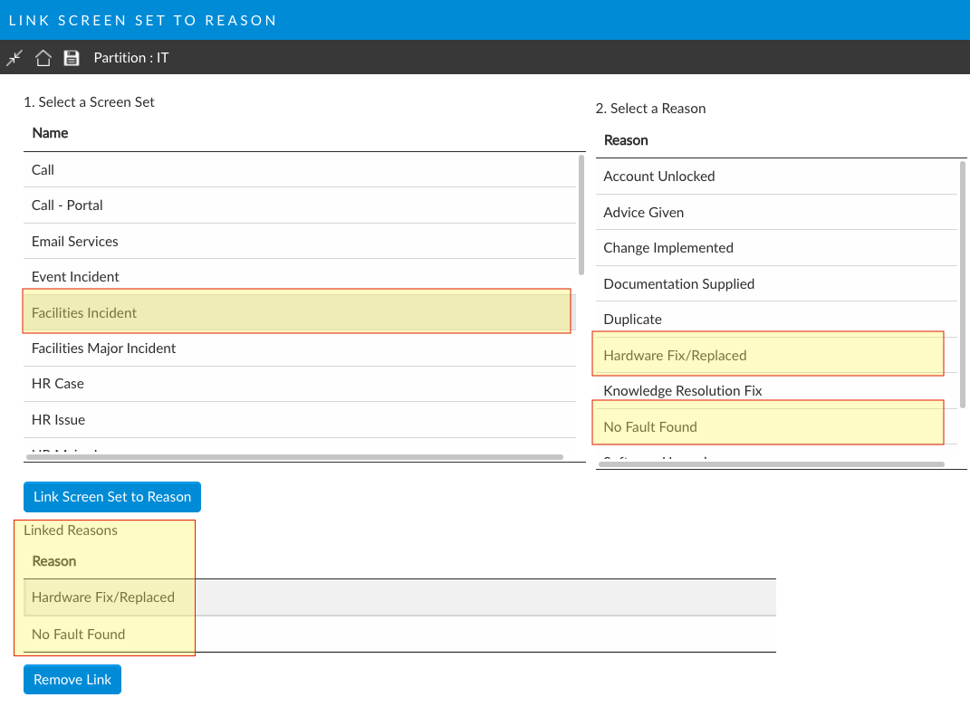6. Select **Link Screen Set to Reason** to add the the reason to the Linked Reasons table.