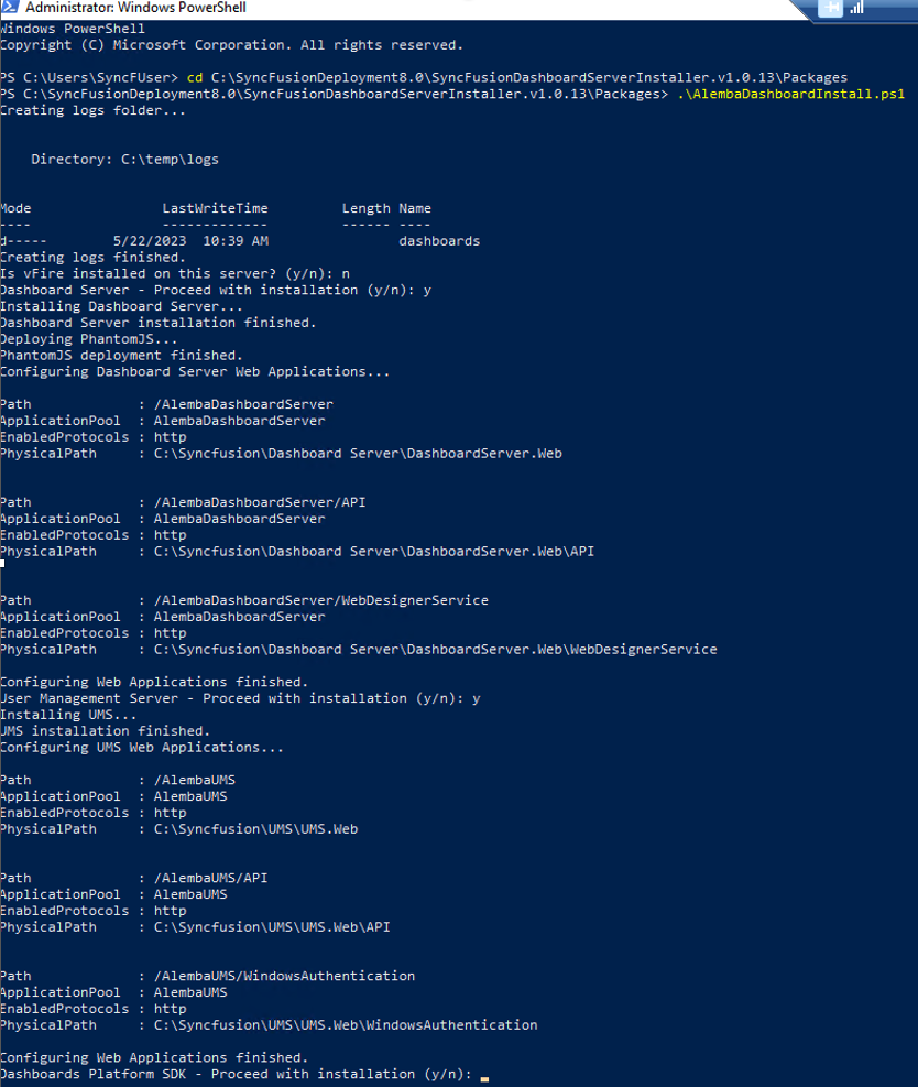 1. **When you are prompted to install the Dashboard Platform SDK**, Answer with a **y**