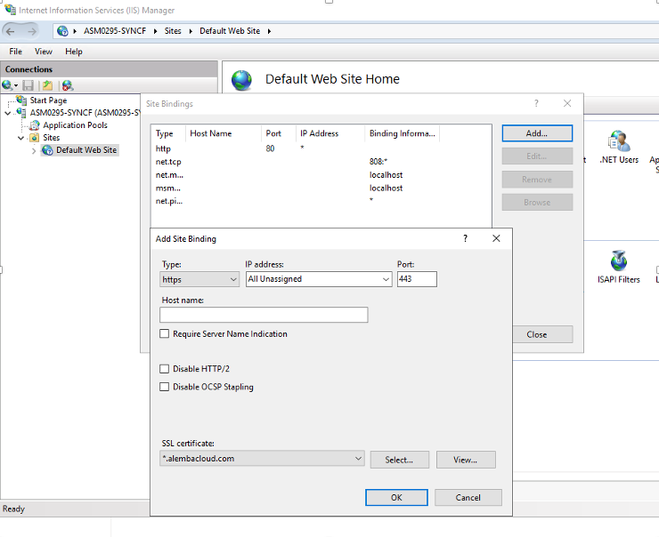 Checking that the HTTPS binding has been configured in ISS (Optional, but should be checked for Cloud Systems)