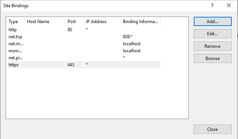 5. &#x20;**If in the new window, no HTTPS binding is defined,** click **Add** and configure as per below: