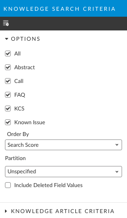 <table data-header-hidden><thead><tr><th width="205.5"></th><th></th></tr></thead><tbody><tr><td>All</td><td>Select to search for all types of knowledge entries.</td></tr><tr><td>Abstract</td><td>Select to search for entries that have the type set to Abstract</td></tr><tr><td>Call</td><td>Select to search for entries that have the type set to Call.</td></tr><tr><td>Directory</td><td>Select to search for entries that are Directory type</td></tr><tr><td>FAQ</td><td>Select to search for entries that have the type set to FAQ.</td></tr><tr><td>KCS</td><td>Select to search for KCS knowledge entries.</td></tr><tr><td>Known Issue</td><td>Select to search for knowledge entries that are Known Issues.</td></tr><tr><td>Website</td><td>Select to search for knowledge entries that are websites.</td></tr><tr><td>Order By</td><td>Select an option from the list to specify how your search results will be displayed. The search results are sorted and displayed based on the option selected. You can order your search results by Search Score, Rating, Most Recent or Profile.</td></tr><tr><td>Include Deleted Field Values</td><td>Select to include deleted values in the search criteria fields, that is, to search for a knowledge entry based on a value that may have been deleted. For example, if an Analyst who created a knowledge entry was deleted from the system, selecting this option adds the Analyst’s name to the list of people you can select in the Created By search field.</td></tr></tbody></table>