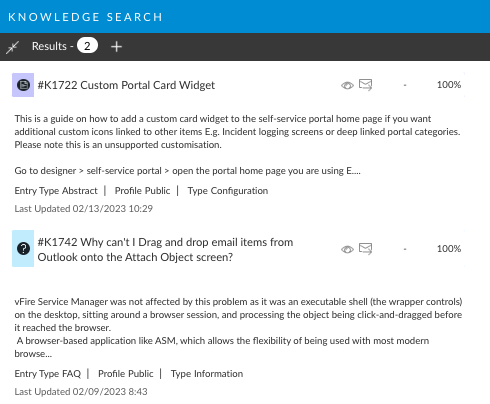 You may see entries that do not appear to contain any of the search keywords entered. This is because each knowledge entry has **Context**, which is the collection of all calls linked to it. The description of each call in the context is indexed along with the text in the knowledge entry. This enables Analysts to find entries that may be relevant to a call by searching for words featured in the description of other calls that these entries have previously helped solve.